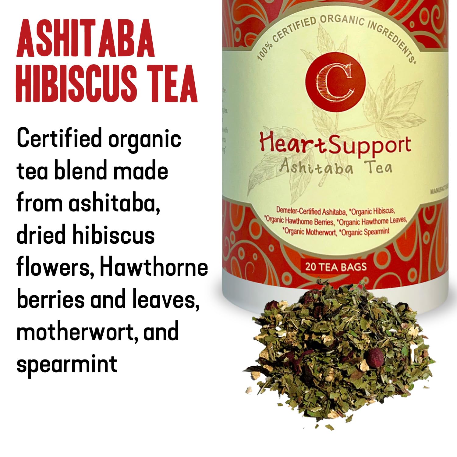 - CERTIFIED ORGANIC INGREDIENTS: Our hibiscus tea blend is a calming herbal tea Comprised of organic dried hibiscus flowers, Demeter-certified Ashitaba, organic Hawthorne berries and leaves, organic motherwort, and organic spearmint.