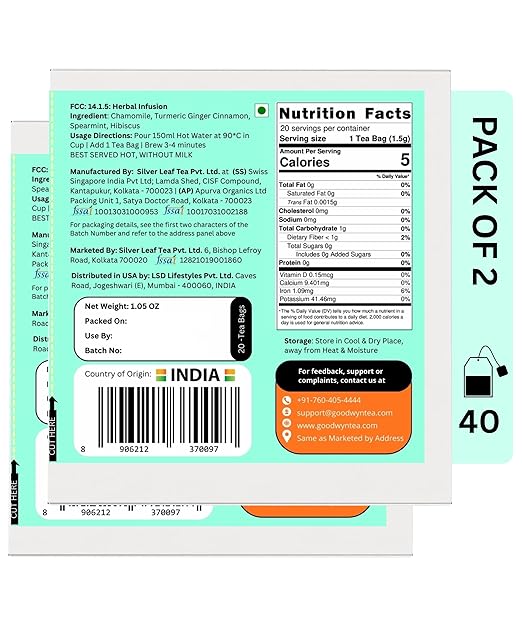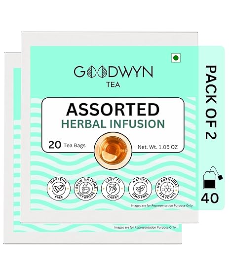 - 4 PREMIUM HERBAL VARIETIES – Goodwyn Assorted Herbal Infusion includes 5 tea bags each of Chamomile, Turmeric Ginger Cinnamon, Spearmint, and Hibiscus—40 bags total offering diverse herbal experiences from soothing to invigorating