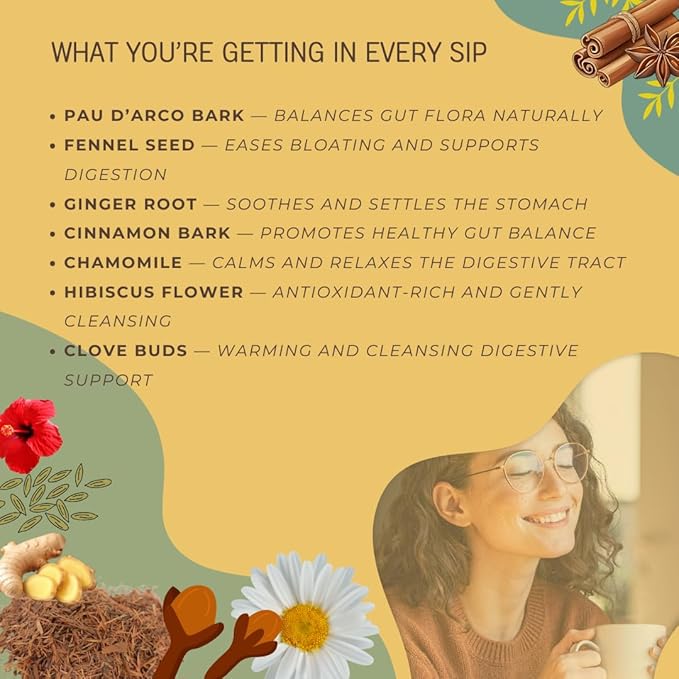 - Support for Gut Health & Balance: Crafted with time-honored herbs like ginger, fennel, and chamomile—traditionally used to support digestive wellness and nurture a healthy gut environment.