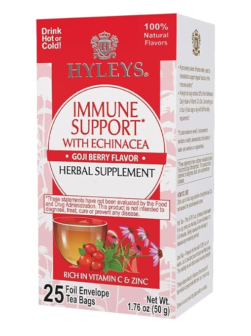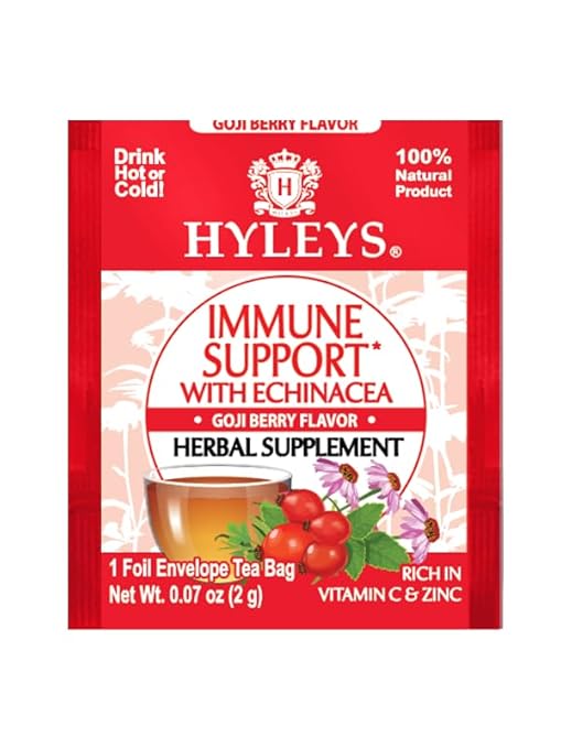 Vitamin C, zinc, echinacea root, ginger root, holy basil, green tea, sweet blackberry leaf, natural goji berry flavor.