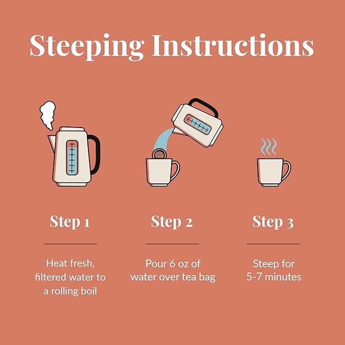 - Steeping Instructions: Steeping herbal tea is easy. Simply heat fresh, filtered water to a rolling boil. Then pour 6 oz of water over the tea bag and steep for 5-7 minutes. Serve hot or let cool and pour over ice.