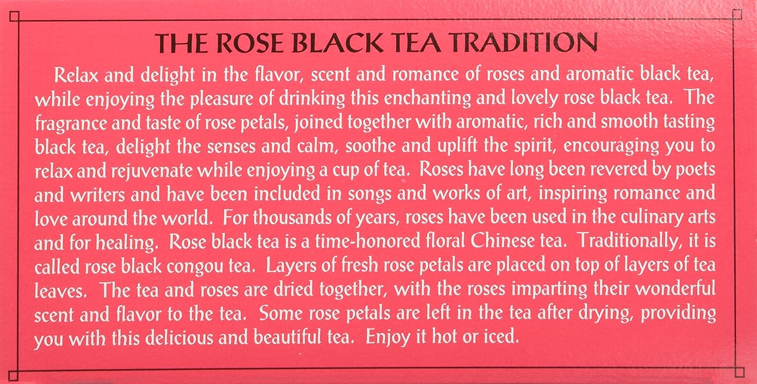 Fragrant rose and aromatic black tea. Romantic, smooth & delightful. Traditional rose congou black tea – delicious hot or iced. Relax and delight in the flavor, scent and romance of roses and aromatic black tea, while enjoying the pleasure of drinking this enchanting and lovely rose black tea. The fragrance and taste of rose petals, joined together with aromatic, rich and smooth tasting black tea, delight the senses and calm, soothe and uplift the spirit, encouraging you to relax and rejuvenate while enjoying a cup of tea. Roses have long been revered by poets and writers and have been included in songs and works of art, inspiring romance and love around the world. For thousands of years, roses have been used in the culinary arts and for healing. Rose black tea is a time-honored floral chinese tea. Traditionally, it is called rose black congou tea. Layers of fresh rose petals are placed on top of layers of tea leaves. The tea and roses are dried together, with the roses imparting their wonderful scent and flavor to the tea. Some rose petals are left in the tea after drying, providing you with this delicious and beautiful tea. Enjoy it hot or iced.